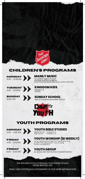 For children aged 0-5 years and their parents/caregivers. Email fiona.kean@salvationarmy.ca for more info.